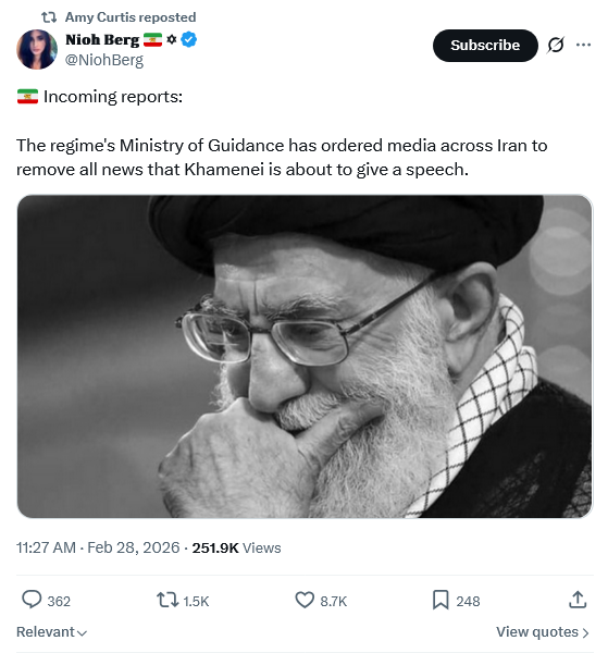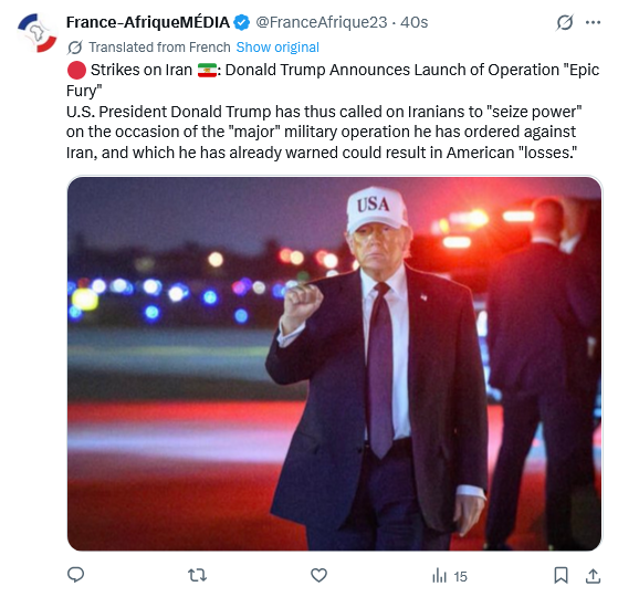President Trump: To the great proud people of Iran, I say tonight that the hour of your freedom is at hand. Stay sheltered. Don’t leave your home. It’s very dangerous outside. Bombs will be dropping everywhere. When we are finished, take over your government. It will be yours to take. This will probably be your only chance for generations. For many years, you have asked for America’s help, but you never got it. No president was willing to do what I am willing to do tonight. Now you have a president who is giving you what you want, so let’s see how you respond. America is backing you with overwhelming strength and devastating force. Now is the time to seize control of your destiny and to unleash the prosperous and glorious future that is close within your reach. This is the moment for action. Do not let it pass. May God bless you all.