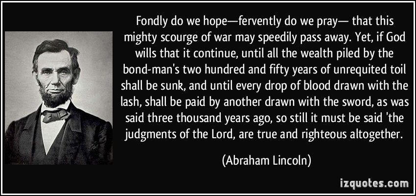“Fondly do we hope, fervently do we pray, that this mighty scourge of war may speedily pass away. Yet, if God wills that it continue until all the wealth piled by the bondsman’s two hundred and fifty years of unrequited toil shall be sunk, and until every drop of blood drawn with the lash shall be paid by another drawn with the sword, as was said three thousand years ago, so still it must be said ‘the judgments of the Lord are true and righteous altogether’.”