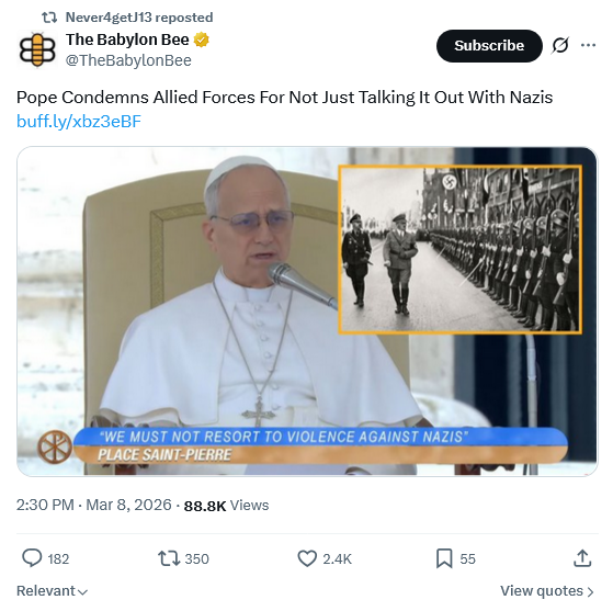 “We must not stoop to violence against Nazis,” said Pope Leo in a general address. “When the Nazis loaded millions of people into gas chambers, that was the time for sincere dialogue. If only the Allied Powers had laid down their weapons and just hugged it out with Nazis, peace could have returned once more.”