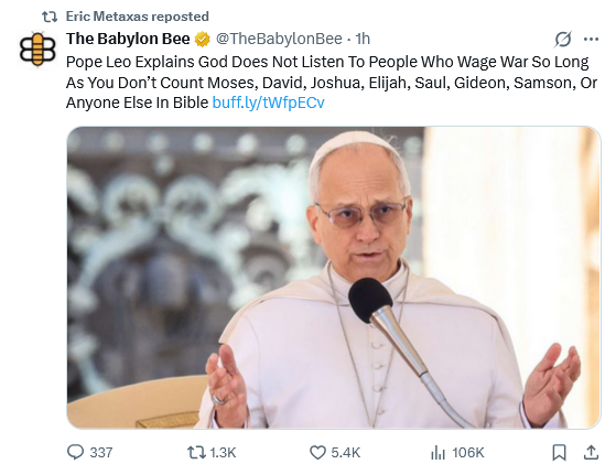 “God will never answer the prayers of those waging war,” declared Pope Leo. “That is, if you ignore that bit in the Bible about God answering Moses’ prayer when Israel battled the Amalekites. And the bit about David’s prayer before facing Goliath. And the bit about God answering Joshua’s prayer when he marched on Jericho. And the bit about God answering Gideon’s prayer when he fought the Midianites. And the bit about God answering Elijah’s prayer at the showdown against the prophets of Baal. And the bit about God answering those Psalm prayers that King David composed when he was at war. And all the other bits in the Bible too.”