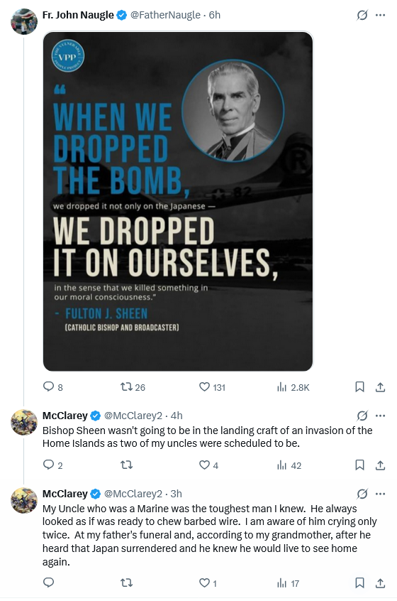 Think the key for the soon to be beatified Archbishop Sheen is the sense of losing something of our moral conscience, which I think is true. Sheen was looking back at something, a decision, and taken with the fire-bombing that happened in both Japan and Germany, something moral was lost.