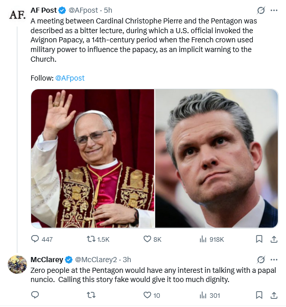 This ridiculous story assumes that the Papal Nuncio would be “summoned” by someone at the Pentagon, rather than “summoned” by Marco Rubio, our Catholic Secretary of State. Then that he was subjected to a bitter diatribe by some unnamed person at the Pentagon and that the Pope was threatened with the fate of Dante’s least favorite Pope, Boniface VIII. Most Catholics know nothing about Boniface VIII. Most priests, if asked about him, would be trying to remember the name from their halcyon days at seminary.