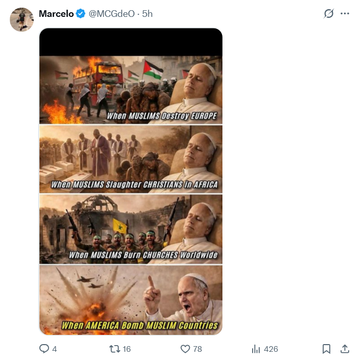 “This is an important step toward helping the Muslims conquer us all,” Pope Leo said. “I do not think that Christians should live in fear of all the things they see Muslims doing in every single Western country they invade. Rather, they should accept the inevitability that we shall all be overtaken eventually and start getting used to it by praying the rosary while facing Mecca.”