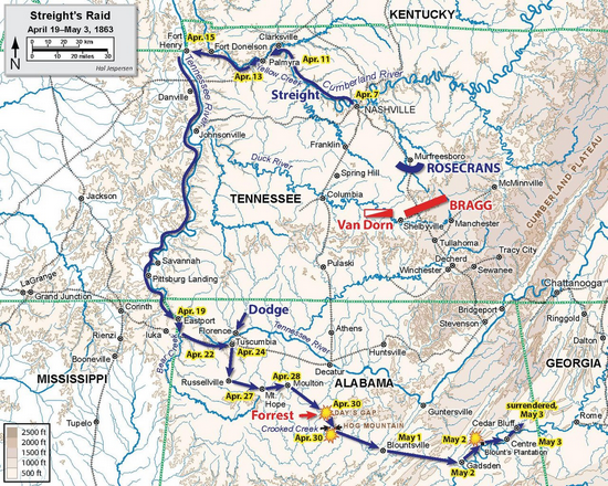 Streight’s raid was barren of accomplishment, except for one very important unintended achievement:Â it prevented Forrest from playing any part in attempting to stop Grierson’s Raid occurring at the same time in Mississippi, a fact for which Grierson and his men were fortunate indeed.