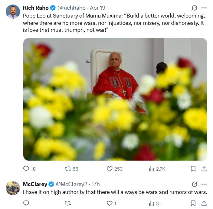 As long as there are evil nations and evil men, there will be war. I prepared the following for elsewhere, but it’s something that pacifist Pope Bob from Chicago should consider.