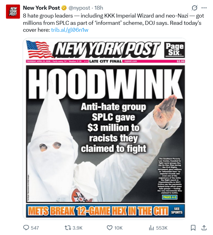 Go here to read the rest. The Southern Poverty Law Center has long been a major league grift to separate corporations from large sums of money in order to buy absolution from racism charges, a traditional shake down racket. Apparently traditional racism is on such life support in this country that it needs funding from the Left to stay afloat at all. Well, now we know who, in part, kept these boys marching: