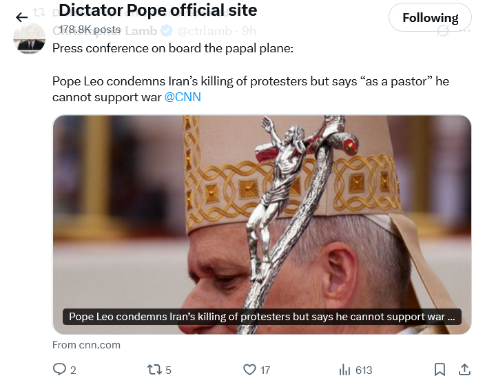 Normally I think a sound policy of any contemporary Pope is to advise the Caesars of the world, when possible, to attempt to avoid war. However, the problem with Pope Leo and the Iran War has been his stridency, misstating Church teaching on war, interspersed with perfunctory remarks against atrocities committed by the Iran regime. Pacifism, which is the defacto stance of the Vatican, gives support to the worst of regimes on the planet and is cold comfort for the subjects of tyrannies. I admit it is often a tight rope walk for popes, but they knew the job was hard before they agreed to take it.