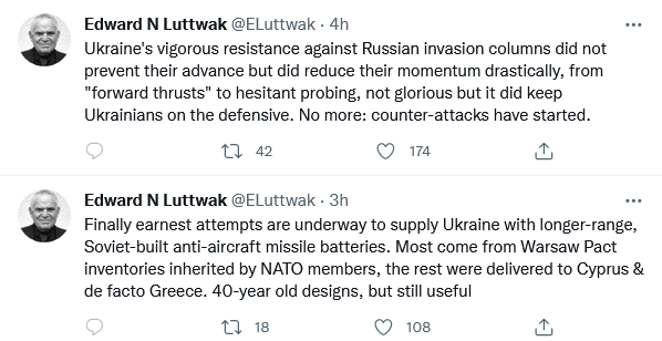 • Ukrainian intelligence reports that Russia may have expended nearly its entire store of precision cruise missiles in the first twenty days of its invasion.